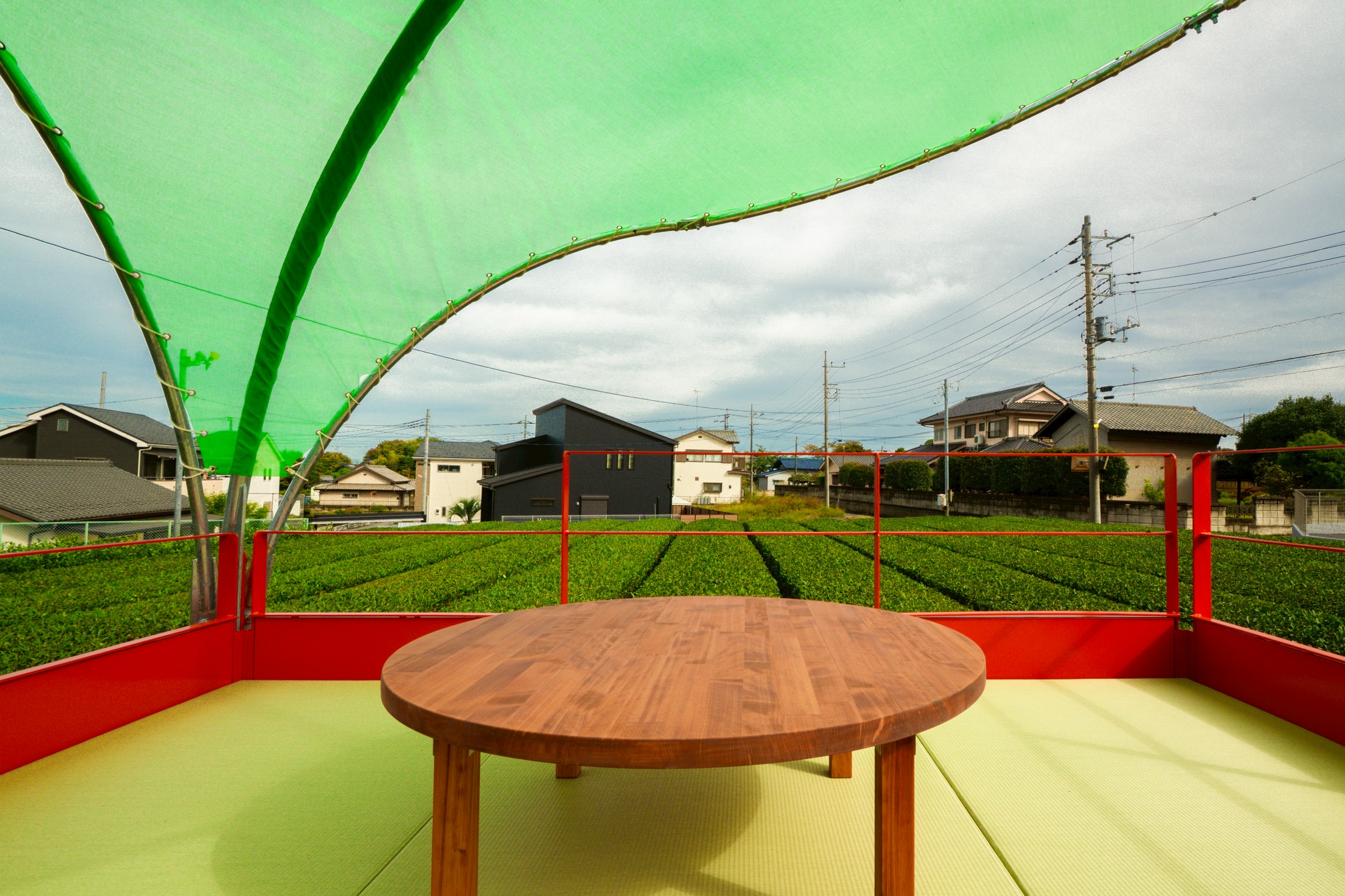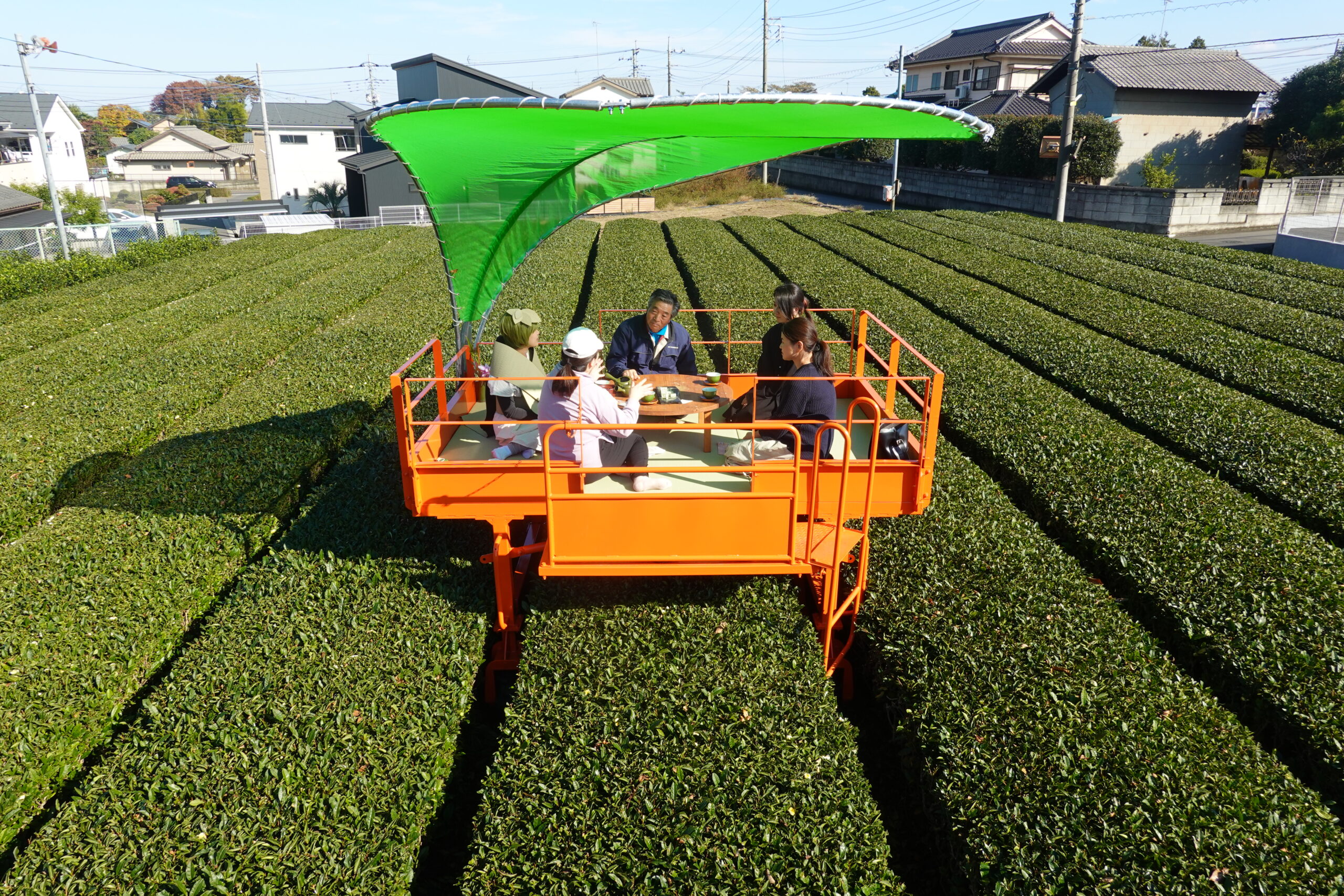 本作は乗用茶刈機と和室を組み合わせた立体作品である。茶畑の上をすべるように移動する「乗用茶刈機」が移動する床ならば、そこは人が過ごす空間になり得る。この視点の転換から、茶畑の真ん中に、畳の空間を出現させるというアイデアが生まれた。