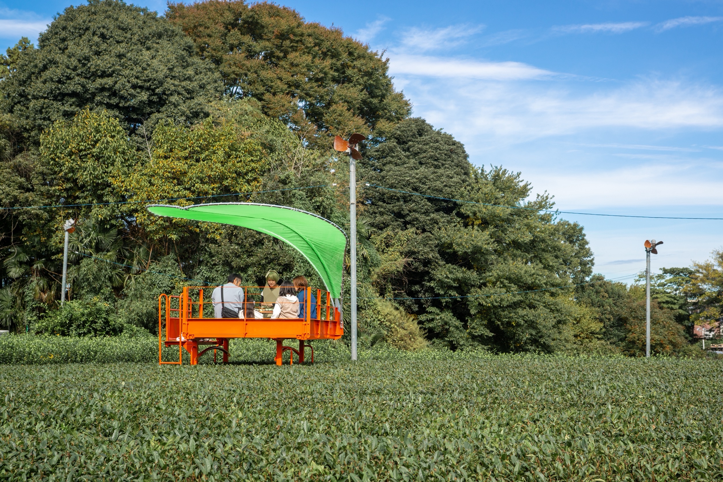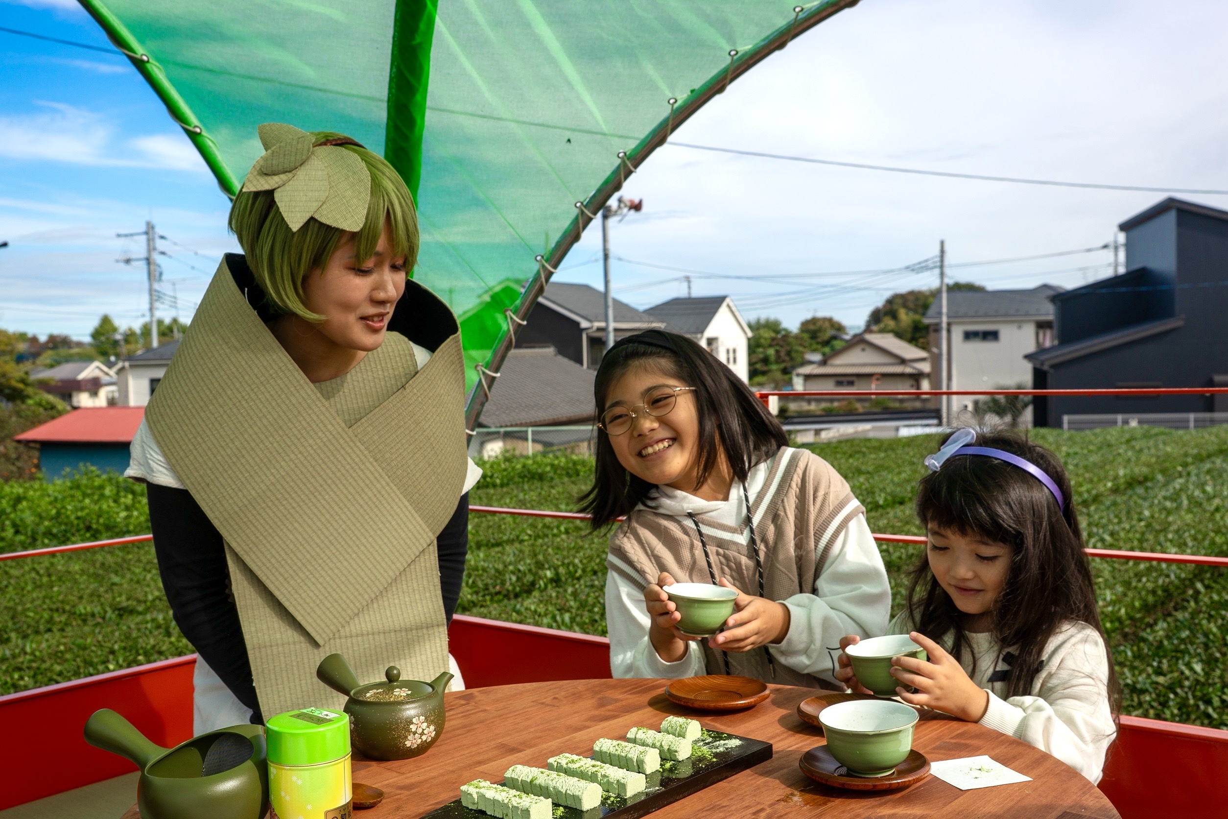 開催期間中、作家は訪れた人々に所沢の名産である狭山茶を振る舞うパフォーマンスを行う。狭山茶には、「茶畑の畝(うね)」を模した緑色のらくがんの茶菓子が添えられ、参加者はそれを味わいながら、目の前に広がる茶畑の風景を「食べる」という体験をする。茶畑に浮かぶ小さな和室で、狭山茶の茶畑を五感で味わう時間が生まれる。